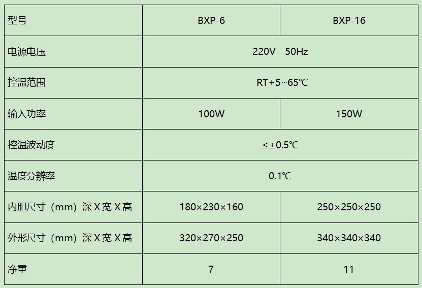 一.結構說明 BXP系列便攜式培養箱由箱體、控溫系統構成。箱體由優質冷軋鋼板沖制而成,表面噴塑處理,內膽采用不銹鋼板制成。內膽與外殼之間采用優質保溫層填充保溫。箱體上裝有高精度數碼顯示儀表及電源開關。 控溫系統采用微電腦芯片處理器,白色數碼顯示儀表。具有PID調節特性、時間設定、溫差修正、高溫報警等功能,控溫精度高、功能強。專業設計的工作室箱體四周加熱,從而提高工作室內溫度的均勻性。 二.技術指數